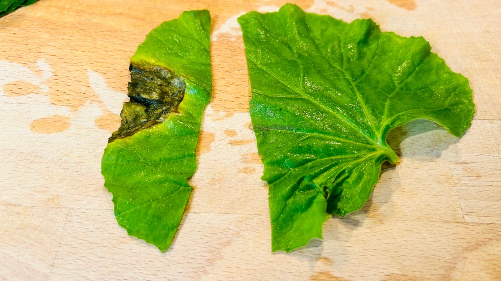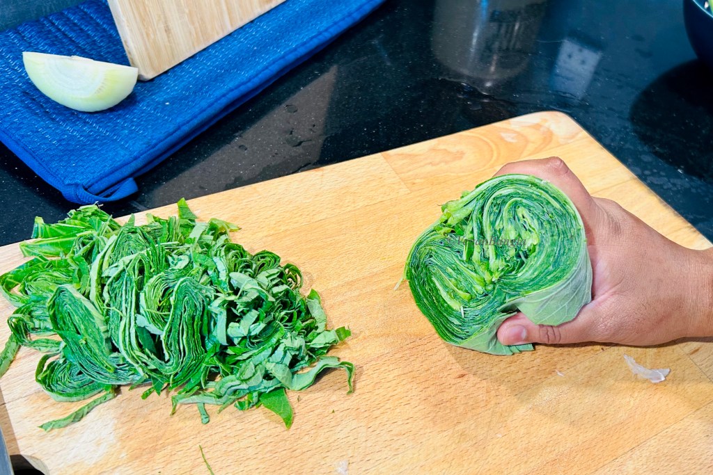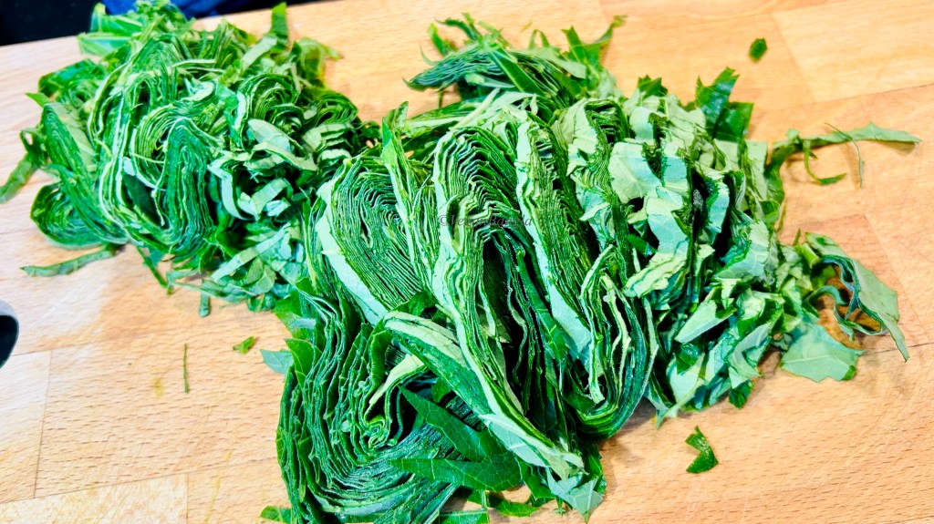 Then I rolled the leaves and and cut the roll of leaves in half and put two parts on top of each other.