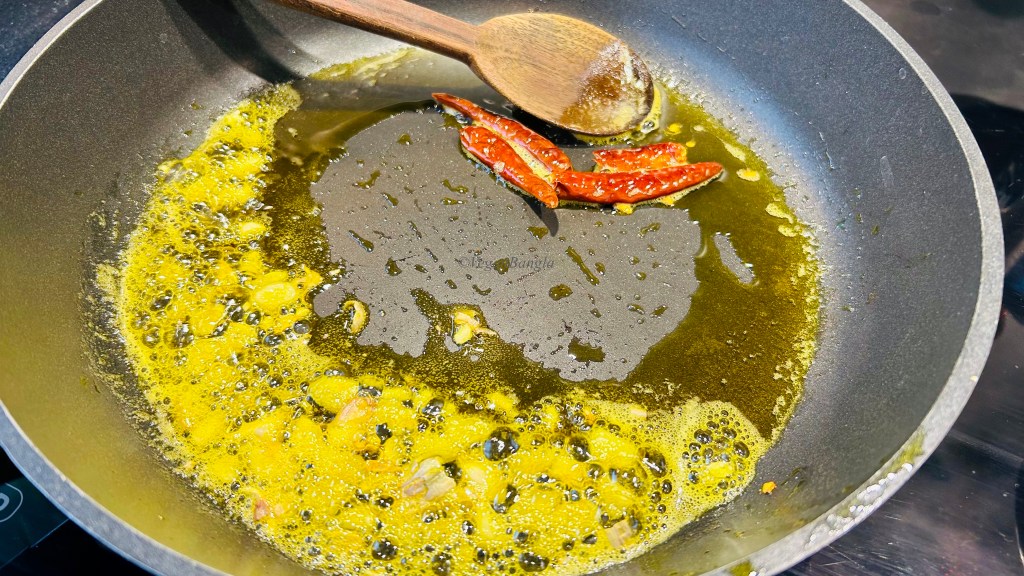 Anyway, the previous bhorta recipe was made by steaming in rice. Today’s recipe is bit more classic. We definitely need all the basic ingredients for making bhorta like lots of garlic, onion and dried chili. For today’s recipe, I have taken 20-30 pieces of Bottle Gourd leaves, few cloves of garlic, one medium sized onion, dried red chili, some salt and mustard oil.