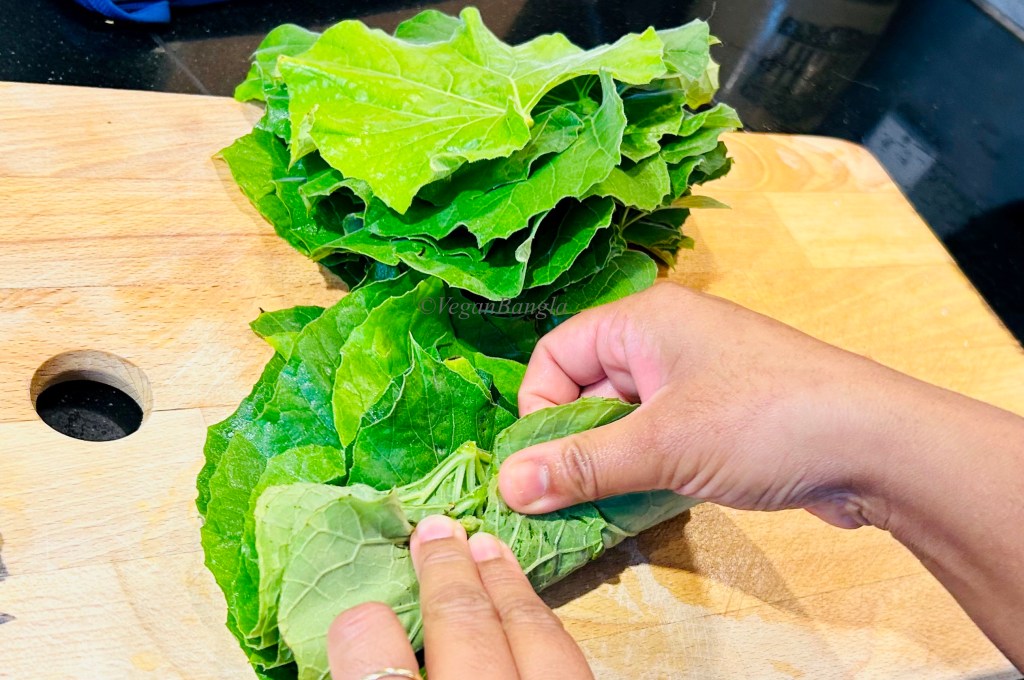 All leaves are shrunk now and extra moisture is evaporated. It means the leaves are all cooked. Then I set the cooked leaves aside to cool them down.