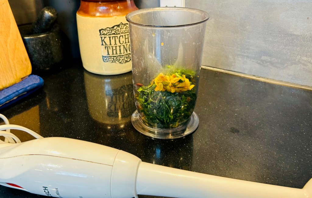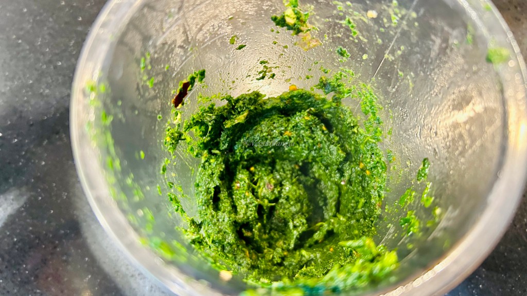 Now take the slightly cooled down leaves mixture into a blender jar. I am going to blend everything to nice and smooth texture. If you like, you can add more mustard oil too.