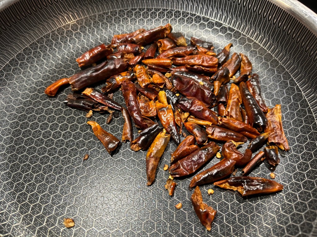 While beans are getting cool, I dry roasted the chilies in a pan without oil until they changed color and got crispy. Then in the same pan, I added some oil, and sauteed sliced onions, garlic, green chilies until they are caramelized. When done, I set them aside and let them cool down too.