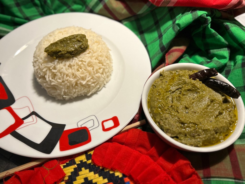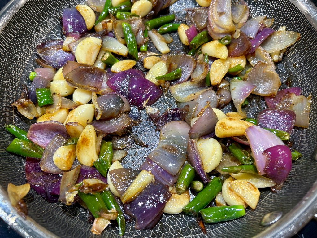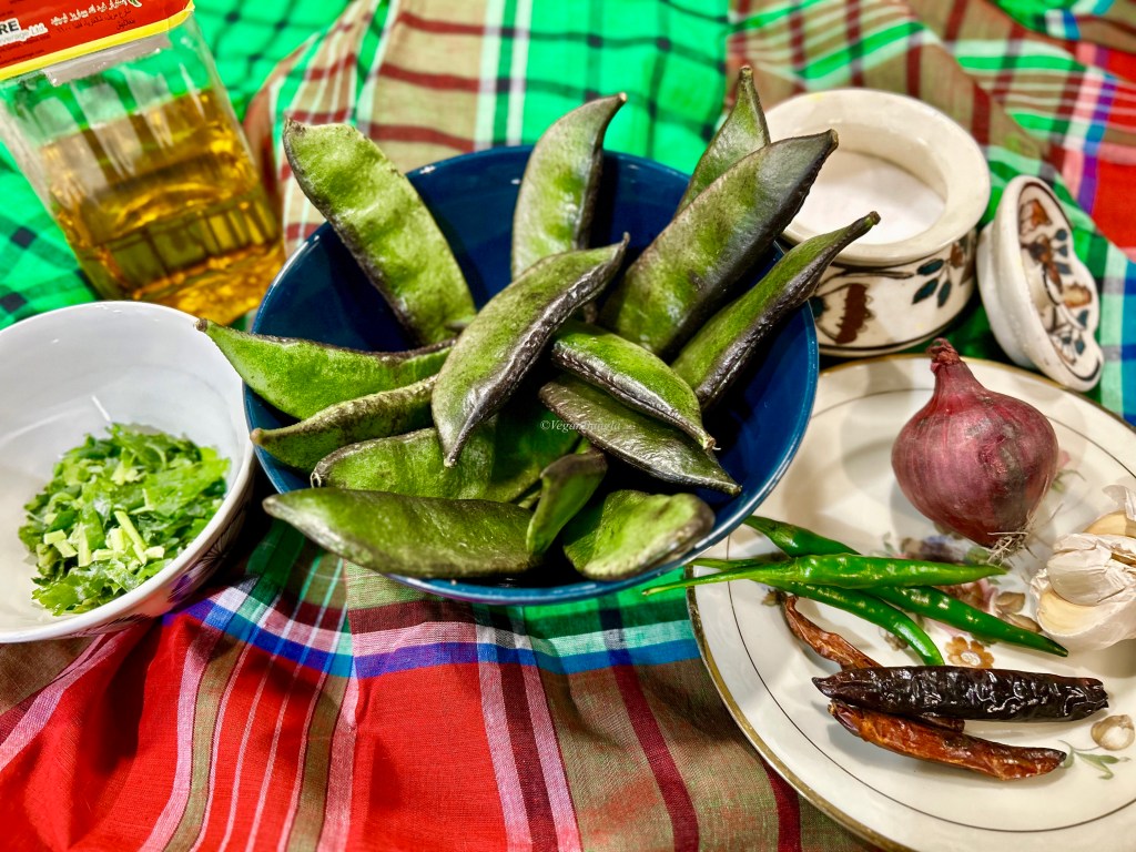 | Ingredients: 200g Hyacinth Beans Spice and Condiments: 1 medium red/white Onion 1/4 tbs fine Salt 20ml Bangladeshi Mustard Oil Dried Chili – as desired Green Chili – as desired Garlic – 4 big fat cloves |