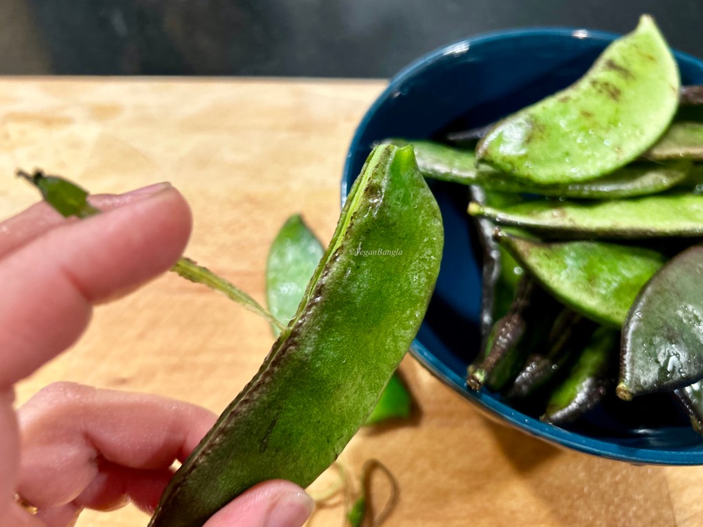 First thing first, we need to remove the hard string like fiber of off the bean pods. To do this, I slit the top with a knife, not all the way down and then pull the strings. It is important to remove this stringy fiber from both edges of the bean pods, as this part does not get cooked and does not taste good either.
