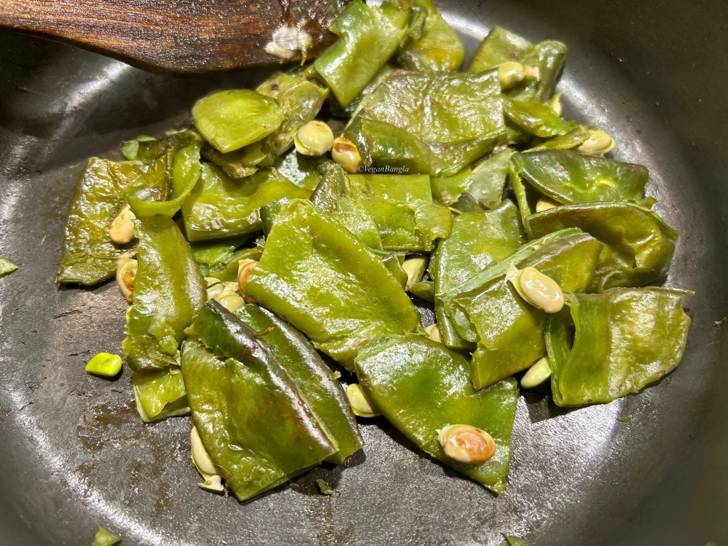 | Instruction: 1. Wash the bean pods and take out the stringy fiber thingy. Cut into small pieces and cook them with just enough water in low temperature. 2. Toast dried red chili without oil and set them aside. Warm some mustard oil in the same fry-pan, fry garlic first until golden in color. Then add onion chunks and green chili and fry until caramelized. Set them aside until cooled down. 3. In a grinder/blender, grind cooled down cooked beans and dried chili, fried onion, garlic and chili, salt and blend again until smooth paste. Add mustard oil too. Serve with rice or make a sandwich filling with the Bean spread. |