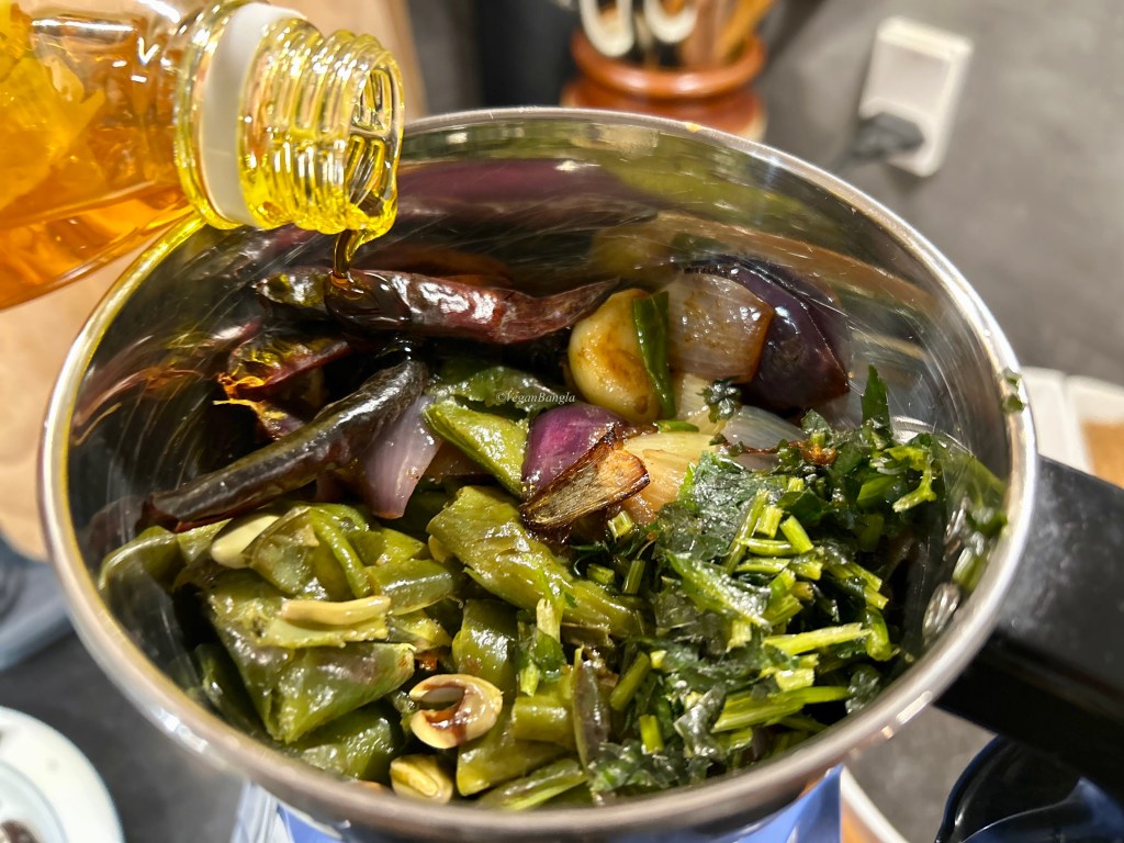 Today I am sharing the classic Bangladeshi shim bhorrta (bean spread) and for this we need the beans of course, chili (both dry red chili and green chili), onion, garlic, salt, mustard oil and green coriander leaves. If you don’t like coriander you can skip it.