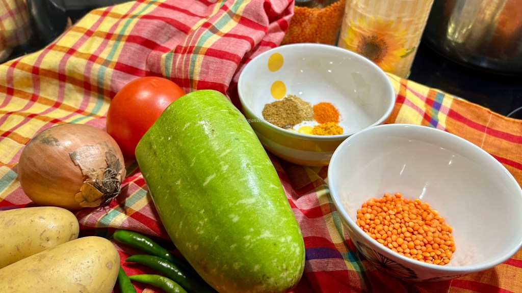 To make today’s curry I have chosen potato and tomato as the pair to go with bottle gourd. Other ingredients are very basic for example- turmeric powder, cumin powder, chili powder, coriander powder onion, salt. fresh coriander leaves and green chili. However, today I have used an extra ingredient – red lentils because I wanted to make the gravy a bit thicker.