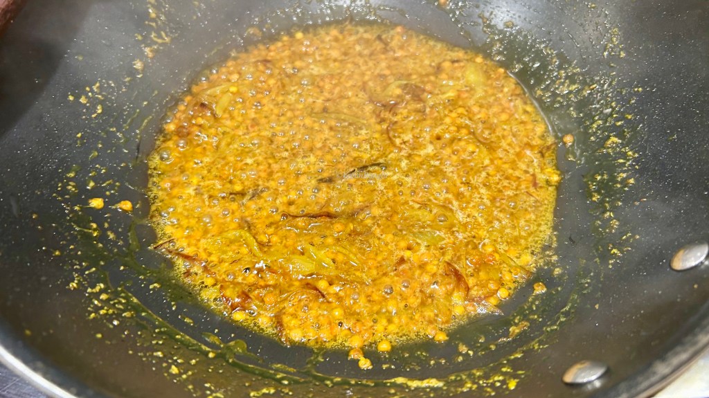 To begin with, I have sauteed some onions in a pan/wok. When onions were golden brown, I added a spice paste to it, which I made earlier. I combined all the dry spices like coriander, turmeric, cumin and chili powers with some water set them aside, that I added to the onion. This way the spices do not get burned. After cooking the spices together with onion, I added washed lentils and continued to cook in low to medium heat. You can add a splash of water to avoid burning lentils.