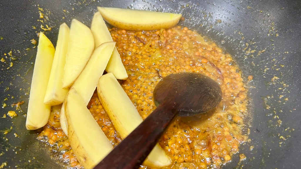 Lentils are half cooked already and oils are getting separated. At this step, I added sliced potatoes and cooked for a while.