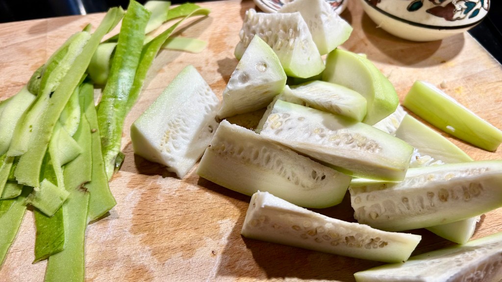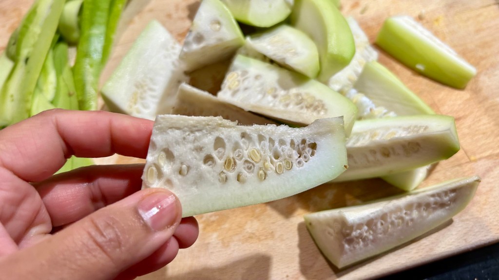 As you can see in the picture, the inner flesh of the gourd is bit like honeycombed, that could mean the gourd is bit old (in Bengali we call it “Batti”), although an older or mature bottle gourd has bigger and harder seeds, which I haven’t found while cutting this gourd. To be honest, it was bit weird to see this texture, although the taste didn’t hamper by this.