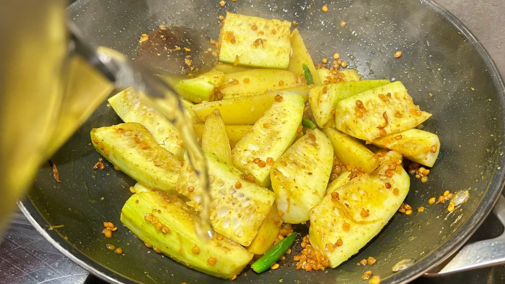 After a 5-6 minutes of cooking the potatoes, I added bottle gourd slices and combined everything very well. After “koshano” or stirring potatoes and gourds for a while, I added some warm water, sliced green chilies and covered to pan to let the veggies cook.