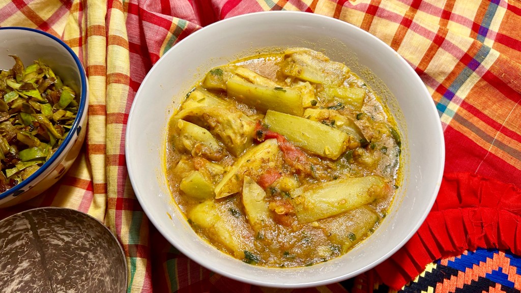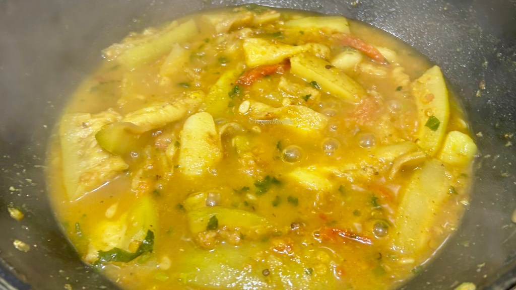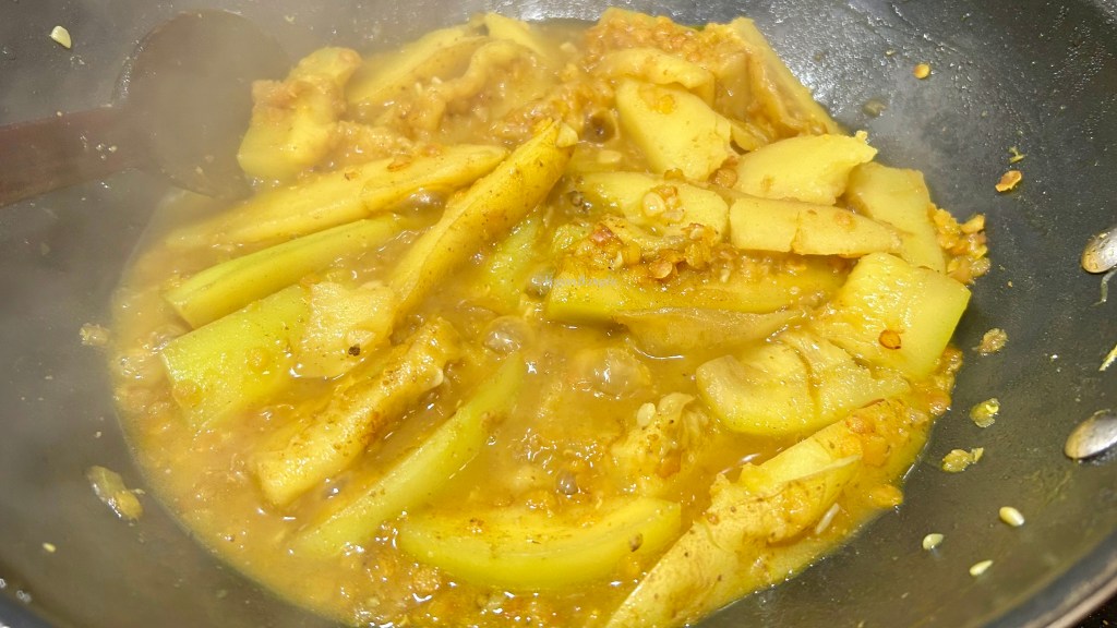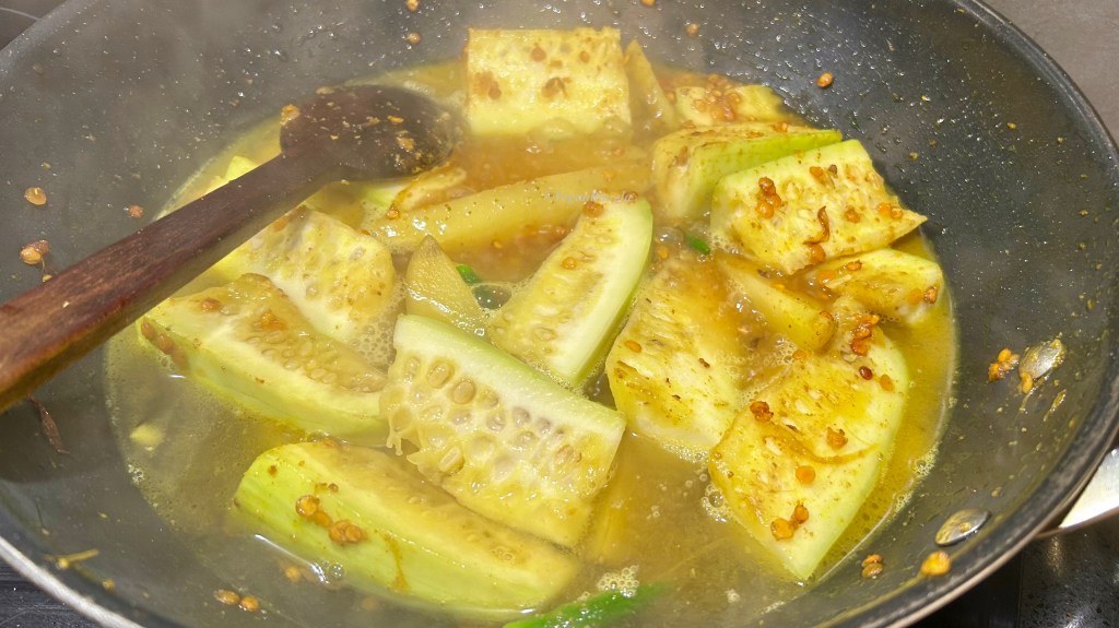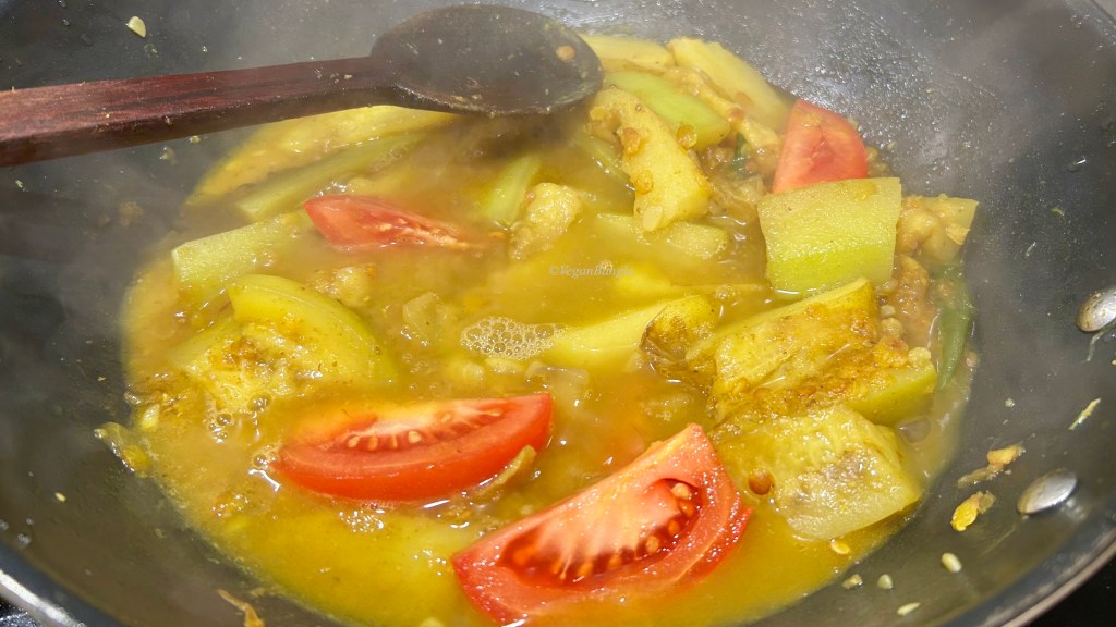 When potatoes and gourds are cooked (check with wooden spoon if they are cooked), then I added sliced tomatoes. Remember, if you add tomatoes earlier, it makes harder for the veggies to get cooked. There’s some enzymes in tomatoes that hinders the cooking process.