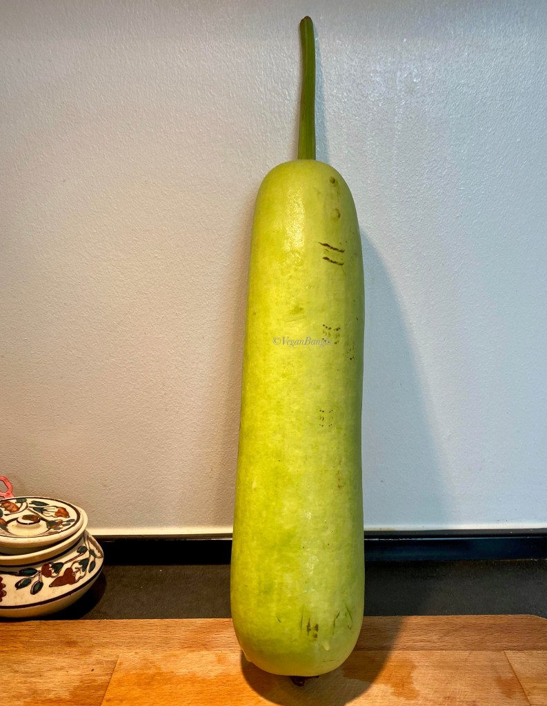 Bottle gourd varies in size, color and shape. Some places it is also known as Calabash. The one I got here today is green with whitish dots on and looks like a water bottle. If you decide to eat the skin, all you have to do is wash the bottle gourd well and instead of using a peeler, use a knife to peel the skin. In this way you can keep some flesh on the skin which would give a nice texture and volume when you cook them.