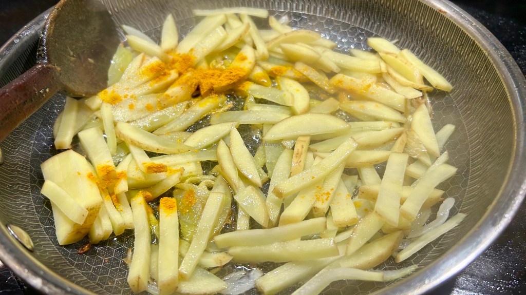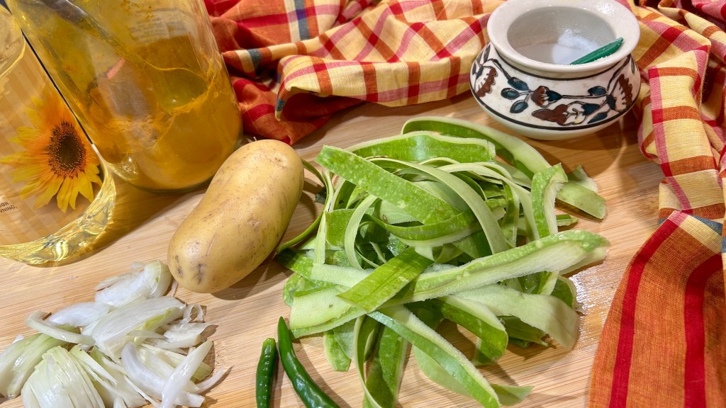 The recipe is very simple but unlike the last recipe, I have used a potato today. Besides bottle gourd peel and a potato, you only need some basic ingredients like onion, green chili, turmeric powder and salt and of course vegetable oil.