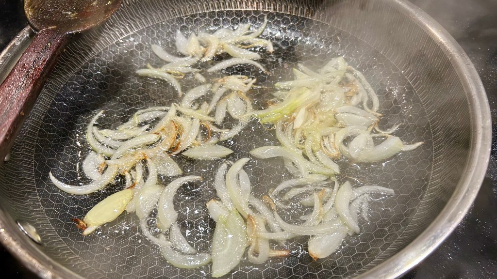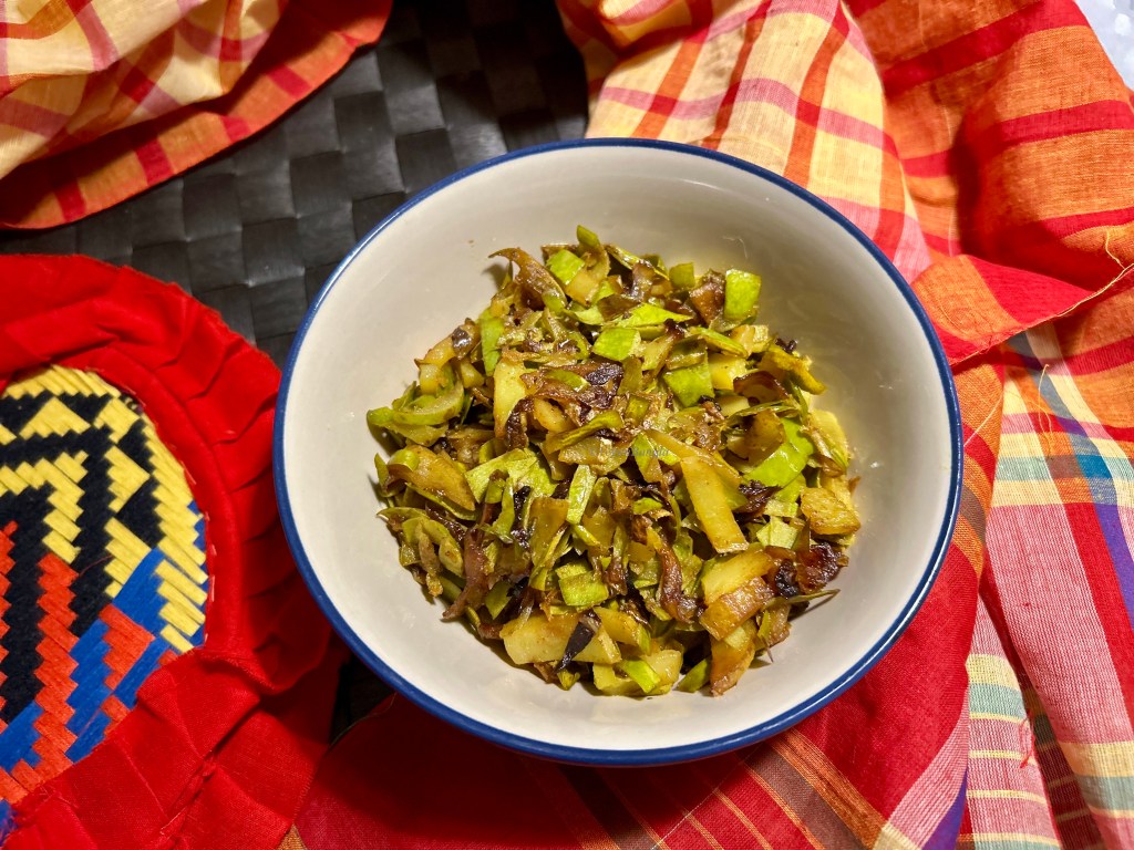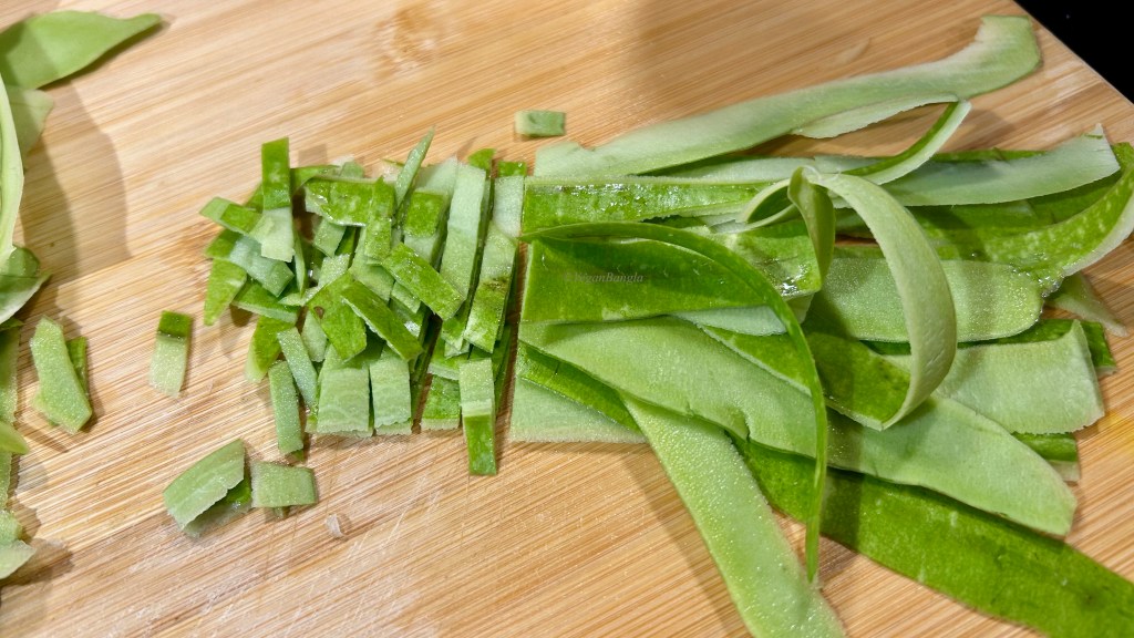 What you need to do first is slice the skin thin. As you can see the skin is very light but as it has some flesh on, it will give some nice texture. Slice evenly to ensure thorough cooking as we will not use any water for this recipe. If you want to make a spread/bhorrta of this skin, then you can use a peeler, but that’s another recipe.