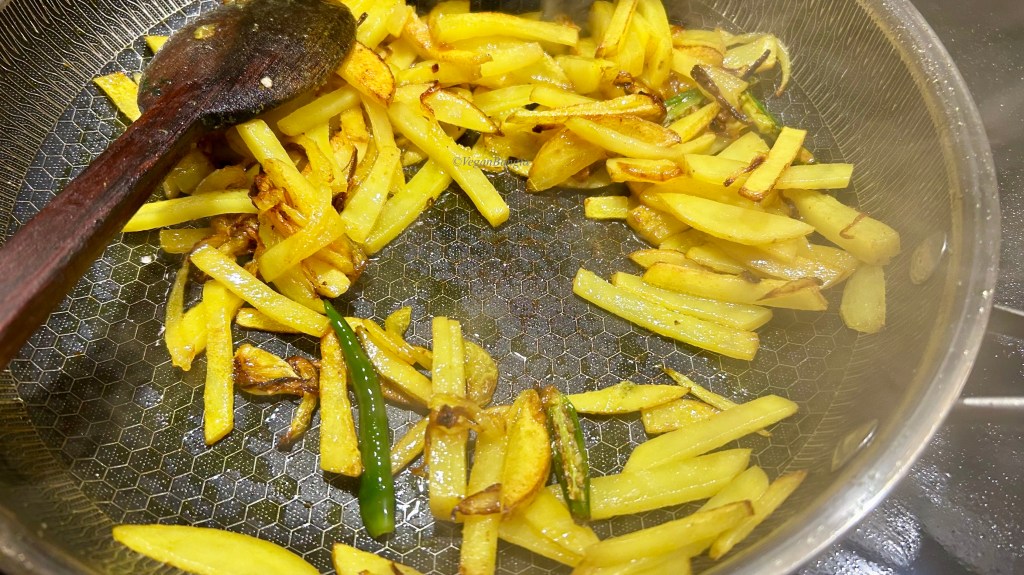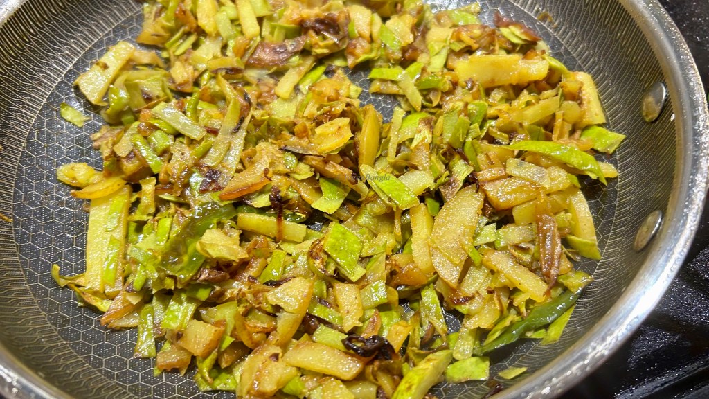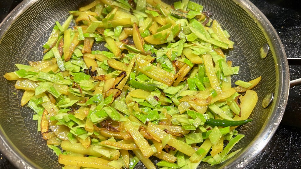 After 10 minutes of simmering in low heat, potatoes and bottle gourd peels looks slightly roasted and reddish. You can take them off the pan now but I will cook more without covering them to to release extra water and make it more drier.